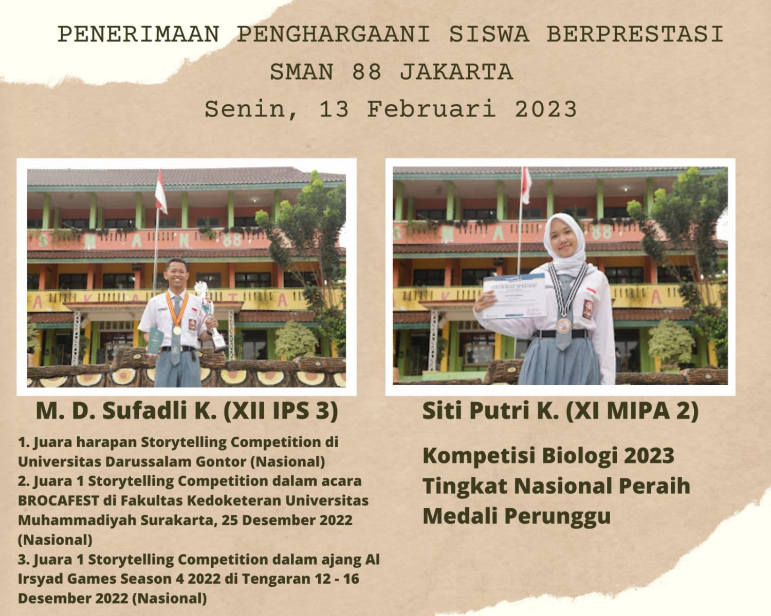 1. Vika Laura (XI-C) meraih JUARA 2 LOMBA DESIGN POSTER TINGKAT SMA/SMK/MA SEDERAJAT SE-JABODETABEK pada GLADIATOR 88 CUP VOL 4.0 pada 25 Mei 2025