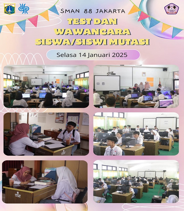 Pada 14 Januari 2025, SMAN 88 Jakarta melaksanakan tes dan wawancara bagi calon siswa mutasi untuk Semester Genap Tahun Ajaran 2024/2025. Kegiatan ini merupakan bagian dari proses seleksi bagi siswa yang ingin pindah ke SMAN 88 Jakarta. Setelah tes dan wawancara, hasil seleksi diumumkan pada 15 Januari 2025.