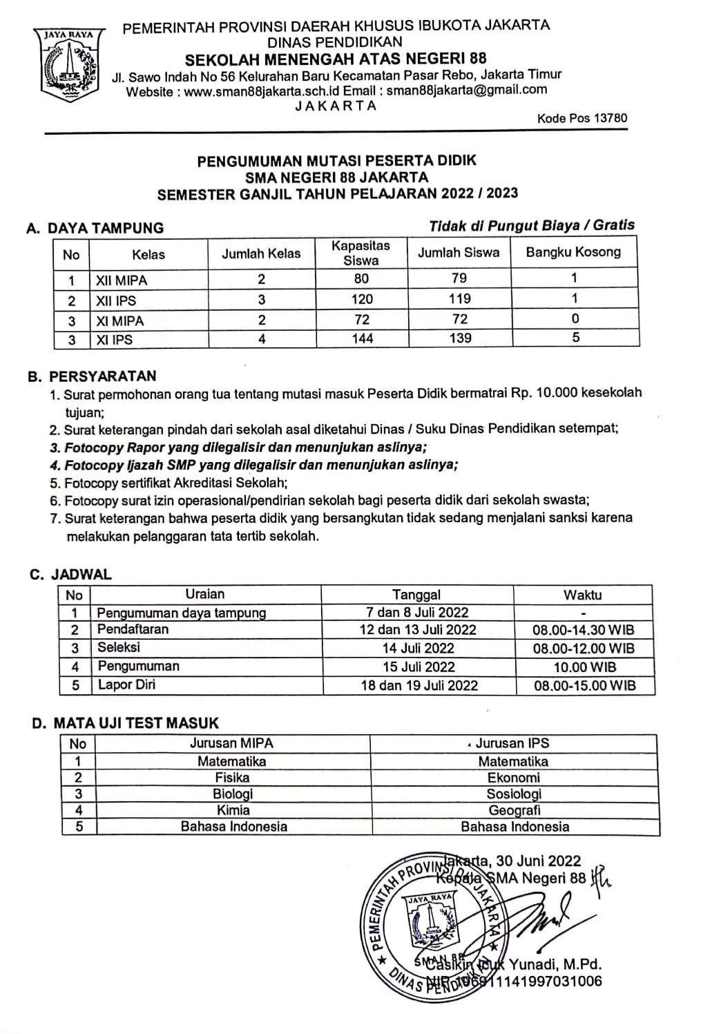 Pengumuman Seleksi Siswa Mutasi SMA Negeri 88 Jakarta, Silahkan download disini